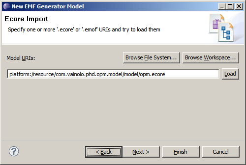 4. Since we have our model file in a project in the workspace, select “Browse Workspace” and find the Ecore model find you want. It should appear in the model URI textbox. You should be able to click on “Load” and nothing bad should happen. Click “Next” once again.