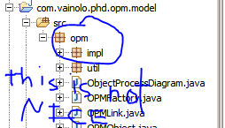 That should do the trick. Not we get to the ugly part of these changes. Not ALL changes done to the genmodel file can be applied to the generated code without causing some problems in the existing code, specially when classes must be deleted or moved (as in our case), therefore before re-generating the code, we’ll delete all of the generated plug-in projects, and the generated source files and plug-in files in the model project. Do this CAREFULLY. If you followed my instructions exactly up to here, you should be deleting the com.vainolo.phd.opm.model.edit, com.vainolo.phd.opm.model.editor, and com.vainolo.phd.opm.model.tests projects (if asked, also delete them from the disk). In the com.vainolo.phd.opm.model project, you should delete the META-INF directory, the build.properties, plugin.properties, and plugin.xml files and all of the files under the src directory. Your workspace should look like this after deleting everything (take a look before you delete):