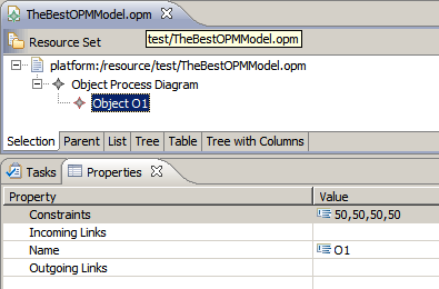8. Good. But before we can see our OPMObjects in our diagram, we must define them constraints. We’ll be doing this in the “OPM Model Editor” that is automatically generated by the EMF framework. So please execute the project, right-click on the model source file (in my case “TheBestOPMModel.opm”), and select “Open With”->”OPM Model Editor” (ignore problems that may occur while initializing the “OPM GEF Editor” and close it if it is open. They are probably caused by a malformed input file that does not contain yet the constraints field):