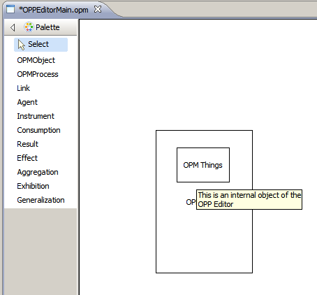 OPMThingEditPart.refreshVisualsmethod is called (same place where the figure’s label is set):@Override protected void refreshVisuals() { OPMThingFigure figure = (OPMThingFigure)getFigure(); OPMThing model = (OPMThing)getModel(); GraphicalEditPart parent = (GraphicalEditPart) getParent(); figure.getNameLabel().setText(model.getName()); parent.setLayoutConstraint(this, figure, model.getConstraints()); figure.setTooltipText(model.getDescription()); } - Fire up your editor, add descriptions to your things (using the properties view) and look at the tooltips. Nice, ah?