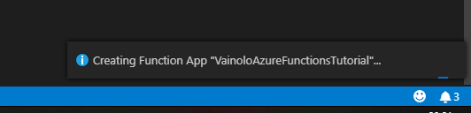For this tutorial we’ll create a new app called “VainoloAzureFunctionsTutorial” instead of reusing an existing one. Follow the prompts to create/use a resource group, and storage account like in the first tutorial. After answer all the questions the deployment process begins: