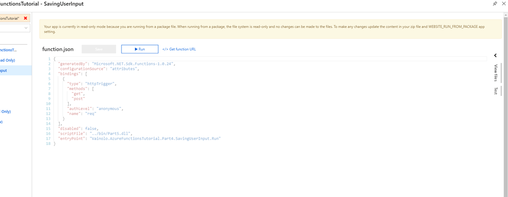 We can go the azure portal to see the new Function App. One important thing to notice is that the code is now read-only in the portal, with a good explanation on why this is the case.