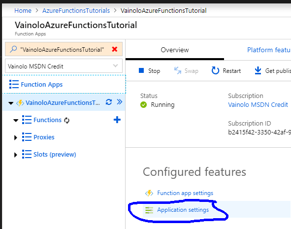 Let’s test the function by navigating to its URL… we get an HTTP ERROR 500! That is because we forgot one thing – remember we defined a special value for the storage account used by the Function? We need to update its value in the Azure App application settings with a connection string to a real account in Azure. So let’s navigate back to the Function App in the portal and click on “Application Settings”:
