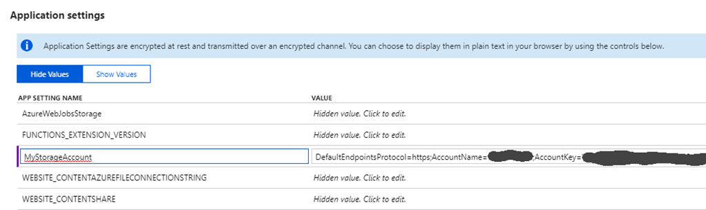 Find the section named “Application settings” (did you know that naming things is one of the biggest problems in software engineering?) and add a new setting named MyStorageAccount with the connection string to the Azure storage as the setting value: