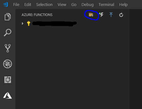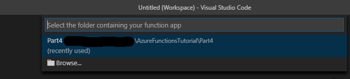 We’ll start by creating a new Azure Functions project and an HTTP triggered function (this will repeat some of what was shown in the linked tutorial for the sake of completeness). This is done by clicking on the “Create New Project” button in the Azure sidebar and selecting a new empty directory to store the project: