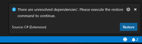 I will not get here into the details of what is a workspace and what are the other options (mainly because I’m learning this myself), so for now just follow the instructions. This process will do a bunch of things and in my case it also told me that I had some unresolved dependencies, so I let the magic do its work by clicking on the “Restore” button: