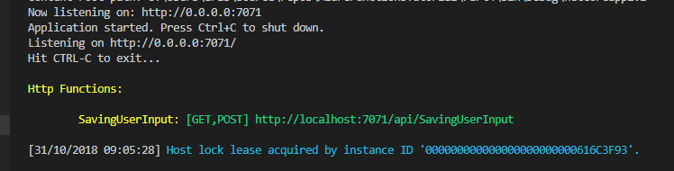 This is a bit more complex than what we encountered working in the Azure portal. My assumption is that this setup allows for more customization that are not available in the portal, but it comes at the price of more complexity. So we are now ready to try the function. Let’s hit F5 to start debugging the function. The terminal will spit some output and finally show the local address of the function, like this:
