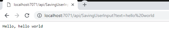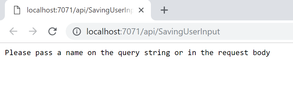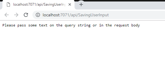 Since there was no value for text, it was not added to the table. We’ll modify the URL and add a query string to it, like this: http://localhost:7071/api/SavingUserInput?text=hello%20world, and will get this: