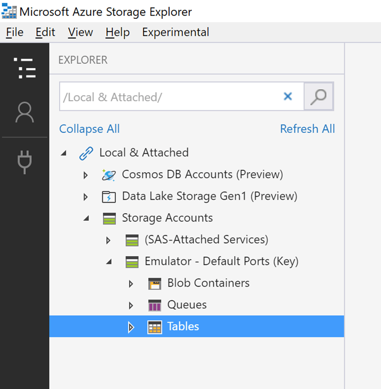- Download the Azure Storage Explorer. This is a great tool to explore Azure storage services and their contents. After installing it, open the storage explorer, navigate to the “Local & Attached” -> “Storage Accounts” -> “Emulator – Default Ports (Key) -> “Tables”, and try to expand it. If you get at error this means that the emulator is not working. Leave this window open as we’ll need it later in the tutorial.