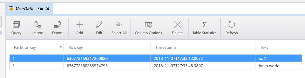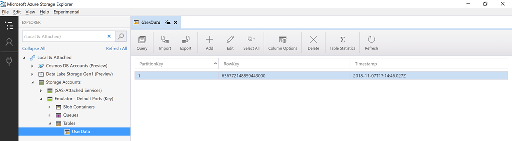 And a new table will appear in the local Azure Table storage with a new row (right-click and select refresh on the Tables node if you don’t see the UserData table).